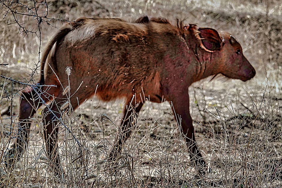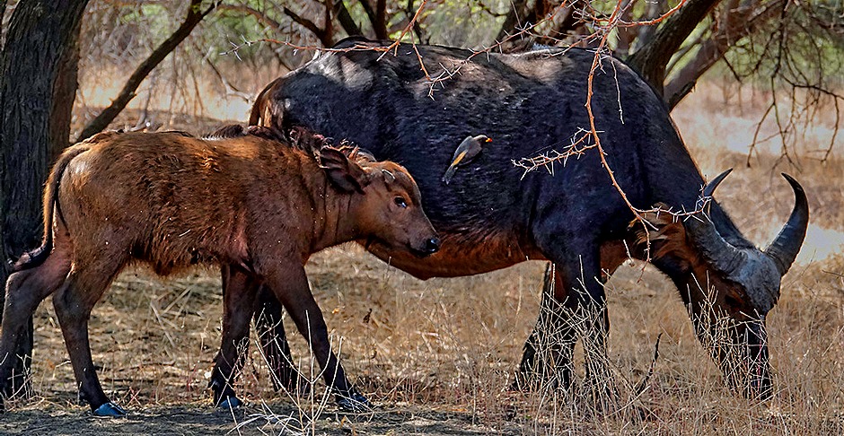 We came upon what turned out to be a young buffalo, sans horns, hurrying through the grass looking like some kind of strange dog or pig from a distance. Then it caught up to its mother who was grazing in the grass, which gave away its identification. If you look closely there is an Oxpicker bird perched on the mother’s side, just above and to the right of the calf. These little birds (6 or 7 inches) spend their time on the hide of buffalo, giraffes, rhinos and other large animals in Africa where they dine on ticks and other insects (as well as the animal’s blood sometimes if there is a sore spot). Most of the large animals don’t seem to mind them; perhaps they are happy to have their parasites removed.