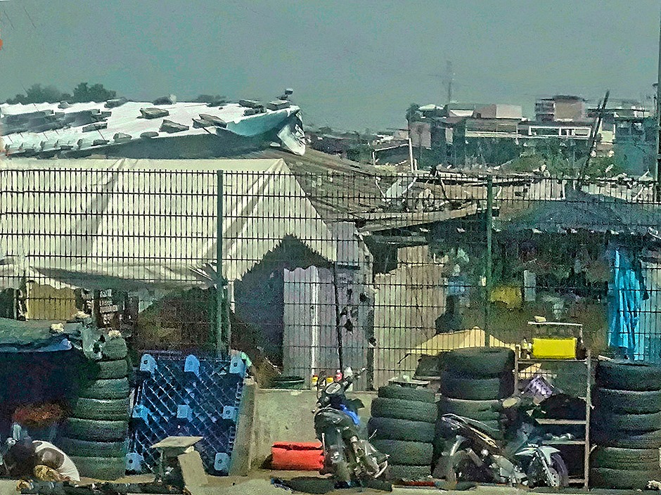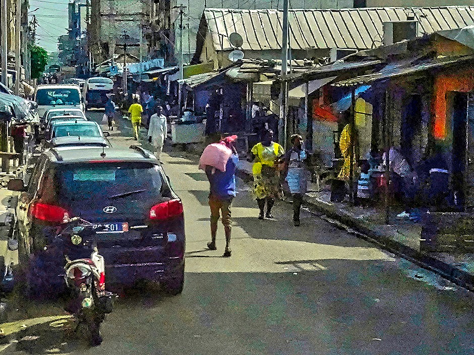We finally did drive back to Abidjan once the folks from the other bus were finished. At one point near the end of the drive a group of soldiers armed with automatic weapons directed all of the traffic off of the main road onto narrow service roads on each side. We sat there for about 15 minutes with the main road entirely empty and nothing happening. Then a single ambulance drove down the main road heading away from the city. A few minutes later we were permitted to drive on. We thought that ambulance must have been for someone pretty important! It gave us a taste of what local drivers must feel like when police accompanying one of our tour buses makes them clear the road for us. So here are some scenes we saw from the bus window, first in Grand Bassam and then during the remainder of the trip back to the dock.