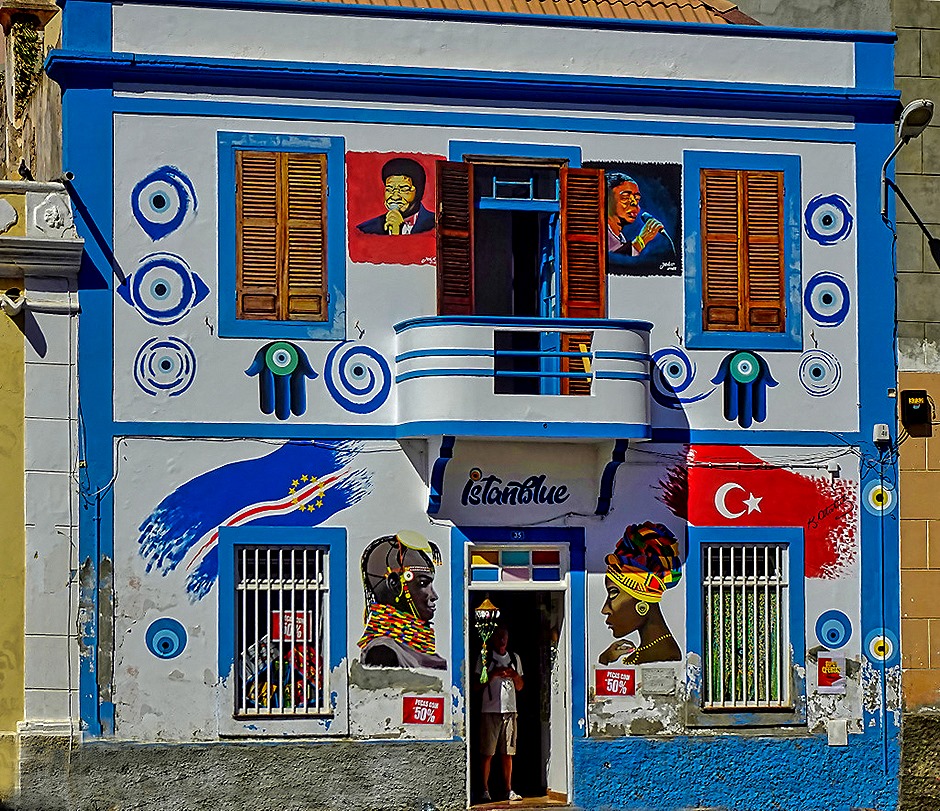 We visited a souvenir store in an art gallery down the way where we learned about Cabo Verde’s favorite folk singer, Cesária Évora, known as the “Barefoot Diva.” A native of Mindelo, the airport is named after her. We walked further down the street to where the library was located, according to Mary’s research. The three story building was there but it was closed up tight and it took us a while to find a small sign, not on the front. We hope it wasn’t closed for good. On the back was a building sized wall painting of Cesaria Evora (photo rather blurred but you get the idea).