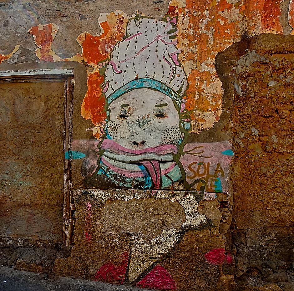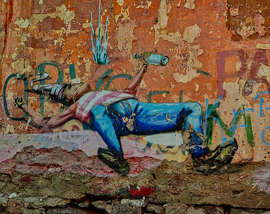 We walked out the back of the market and along a small street to reach a road that ran along the edge of a cliff with an extensive view across a valley containing another part of the city. We walked to the right and passed a wall with some interesting graffiti.