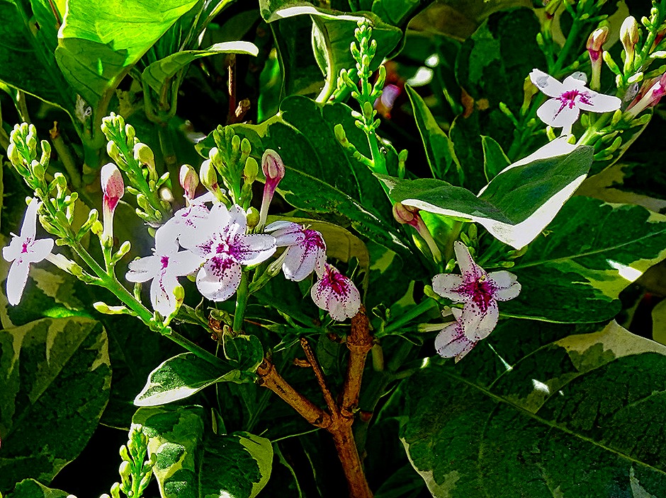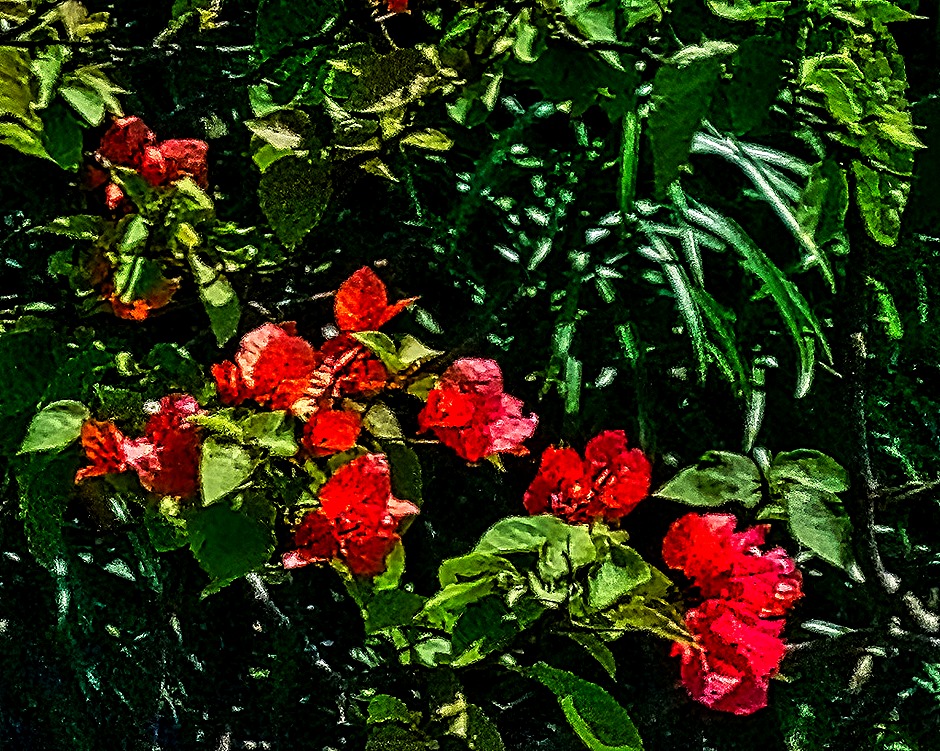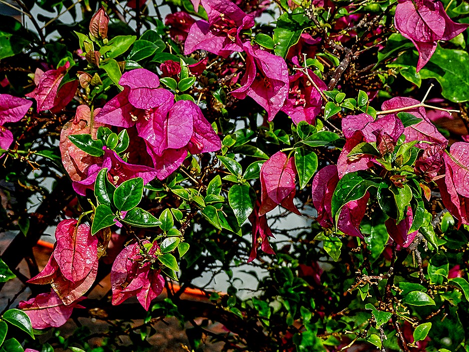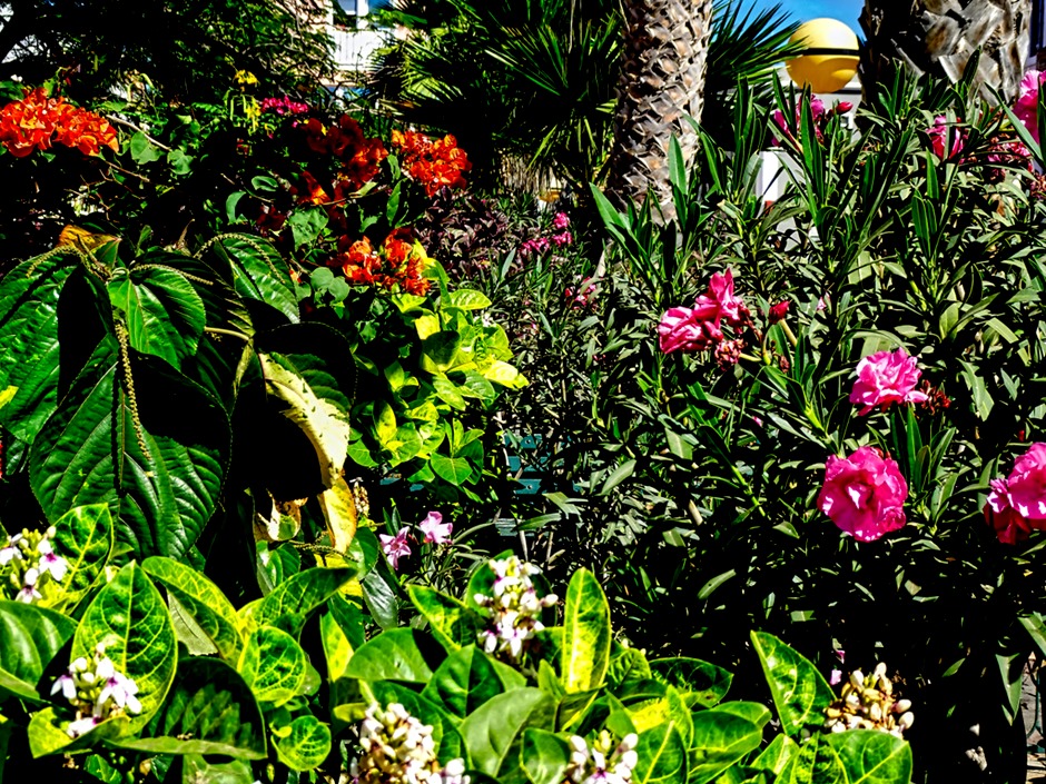 It turned out we had inadvertently come full circle. At the end of the street our restaurant was on we saw the Capilla del Cristo, a small chapel built in the 18th century. Legend has it that during a horse race one rider lost control and went over the wall. A bystander invoked the deity to save him and although the horse died the rider lived. This chapel was reputedly built as a monument to this miracle. The chapel is only open one day a week and it wasn’t the day we were there, so we weren’t able to see the inside. But the left side of the chapel in the picture below is also one side of the Parque de las Palomas we had visited in the morning and a number of the park’s denizens were perched on top under a dull gray sky. We walked on toward the shuttle bus stop, stopping for a while in a small park full of flowers where we talked to our daughter on the phone (easy since this was in the US). The bus was waiting when we arrived and took us back to the ship.