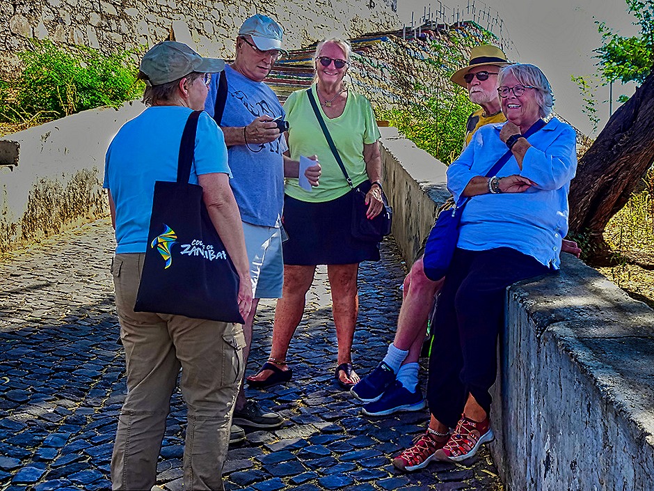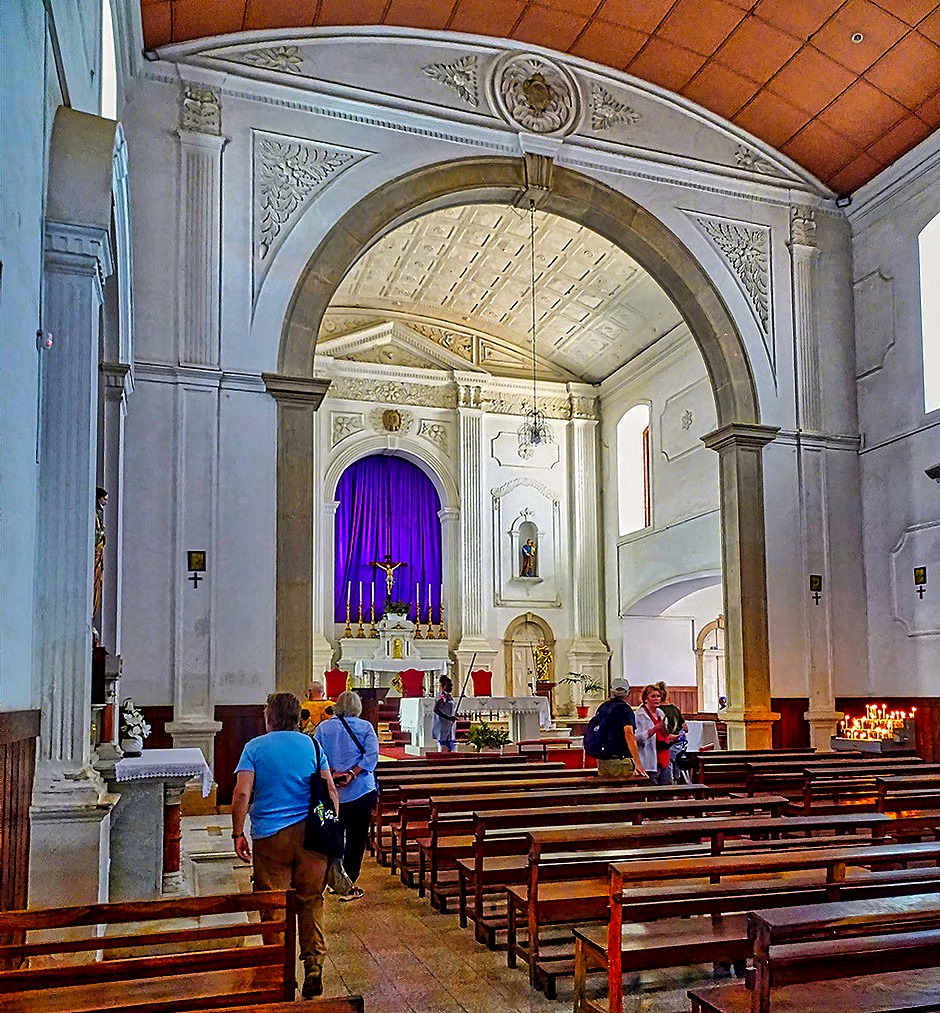 We stopped by the large 1956 monument to Diogo Gomes, one of the men who discovered this island in 1460. It stands near a corner of the plateau that houses the center of the city and from the walls here we could see in two directions. To the left we could see Zaandam docked across the bay. To the right we looked over the beach of Gamboa and an island to the left not too far from shore called Santa Maria Island. This island was the first stop on Charles Darwin’s 1832 voyage on the Beagle, and where he made his first geological observations. It is now connected to the shore by a bridge about the length of a US football field. In the distance on a jetty you can see between the island and the shore is the Farol de Dona Maria Pio, a lighthouse built in 1881 on the southernmost tip of the island. It was named after the Portuguese queen at that time. Its tower is octagonal and is about 60 feet tall.