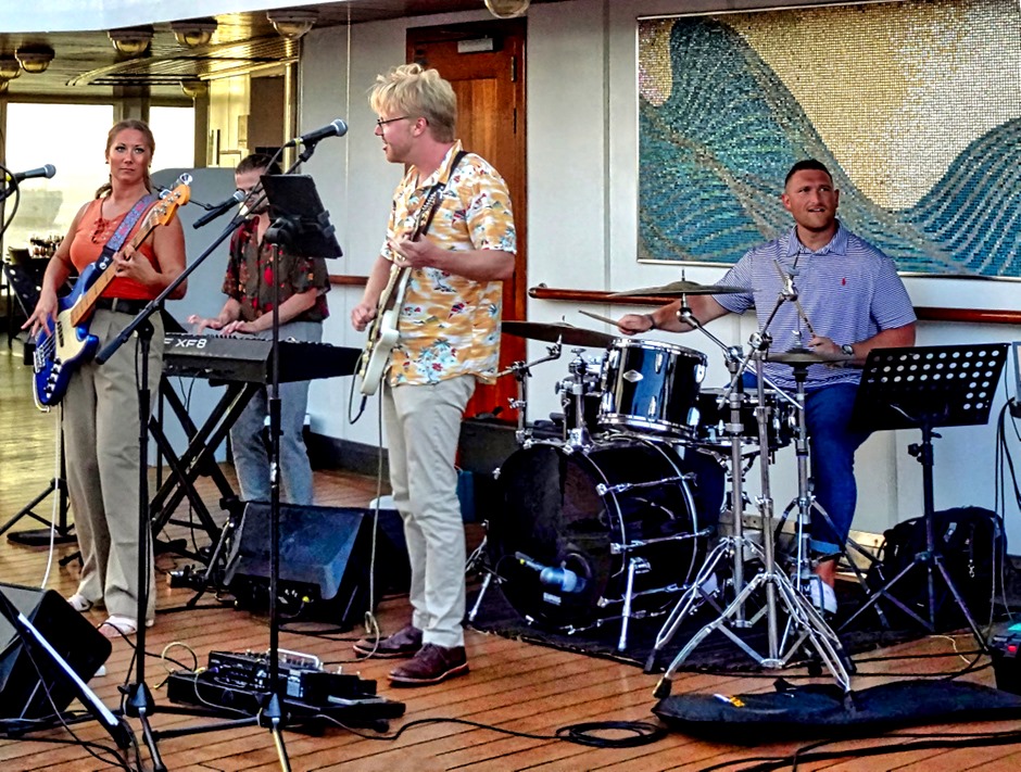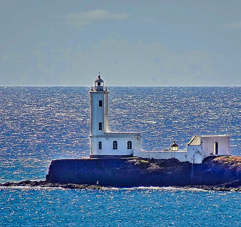 This being our last African port there was a sail away party on the aft deck with the very good Ocean Bar band playing rock music. It was nice out except for a very strong wind. To our left in the port was what looked like a huge rock emerging from the water to form an island called Ilheu dos Passaros. On top of the dark rock island was a white structure leading from the top to half way down. This turned out to be the Farol de D. Luis, a lighthouse. We were gone by the time the sun set so we didn’t see it lighted up but we understand that the light is right at the top of the rock with a small 15 foot tower and a white stairway down to the keeper’s house halfway down. The lighthouse was built in the early 1880’s and named for the then king of Portugal. Also to our left on top of a tall hill was the Fortim d’El Rei, a fort built in 1852 to defend the Porto Grande Bay and the city. Its military use ended in 1930 and it has since fallen into disrepair from neglect. We saw this fort from the shore in town as well.