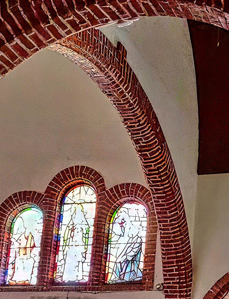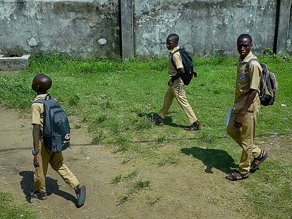 We drove through the sometimes crowded streets and parked by an alley. We were instructed to walk down the alley where we came to the Cathedral du Sacre Coeur, the seat of the local Catholic diocese and the oldest cathedral in Cote d’Ivoire. It is modest compared to most cathedrals we have seen. A small wooden church was built on this spot in 1896 but it was deliberately burned down a few years later while combatting yellow fever. The current building opened in 1910. We milled around outside for about 20 minutes while our guides tried to negotiate our admittance but to no avail (One passenger insisted loudly that we had been barred for racial reasons, which we don’t think was true). Finally we were instructed to walk back to the bus, so we never saw the inside. Our friend Robert, however, stepped inside the front door and took some pictures before we were informed we were not welcome. While we waited in the bus for our guides to return, we saw some school children dressed in uniforms probably off to lunch.