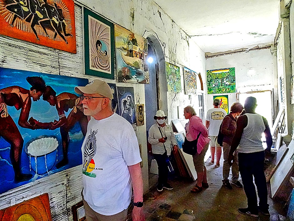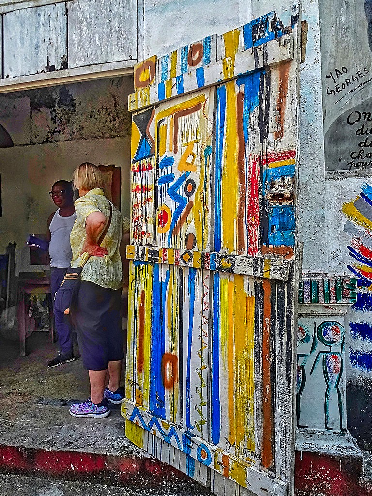Next we drove to the Maison des Artistes, billed in the excursion description as “a cooperative of craftsmen selling . . . paintings, masks, batik and woodwork.” Maybe we missed something here, but we didn’t see any craftsmen working or selling and the only art we saw was paintings. The gallery was not very big, the rooms were small and dim and we had to stay in line as we went through the building. On the way there we passed the municipal library, always a highlight for us.