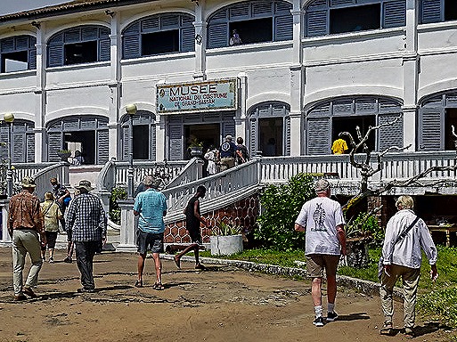 After lunch we were told to reboard the bus. After a while all the passengers and our guide moseyed aboard and we were driven . . . about one block to park again outside the costume museum. We sat there for more than half an hour while the folks from the other bus visited the museum. We have no idea why they didn’t visit it before lunch like we did or what they were doing instead, but this was really no fun at all. Why couldn’t we have visited one of the other landmarks promised in the tour description that we never did see? Or since this was the end of the tour of Grand Bassam they could have just driven us back to the dock at that point, but they said they had to wait and travel along with the other bus. Very puzzling and irritating.