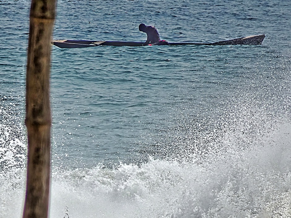 We boarded the bus yet again for the short drive to our lunch spot. We had a very good buffet lunch, with local beer included, outside under tents near the sea shore by a hotel. We didn’t know its name, but a friend who took this excursion on a later cruise identified it as the Hotel Etoile du Sud (thanks Pete). Vendors were selling various souvenirs under a shaded structure by the beach and there was a fellow in a canoe just beyond the very active surf.