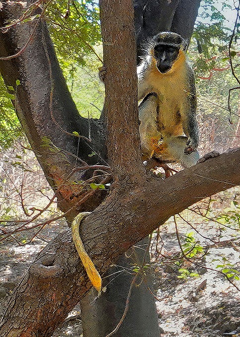 We don’t know the names of all the animals we saw but will do our best. Our first encounter was with a Green Vervet Monkey, which seem to be plentiful in the reserve. They have black faces with orange, white and black fur, with very long tails. They are found as far afield as the Caribbean, where we saw one once in Barbados.