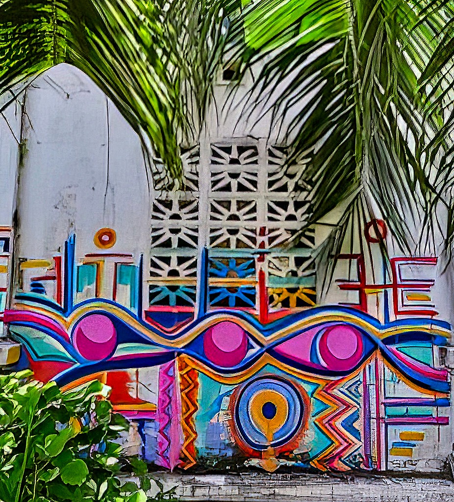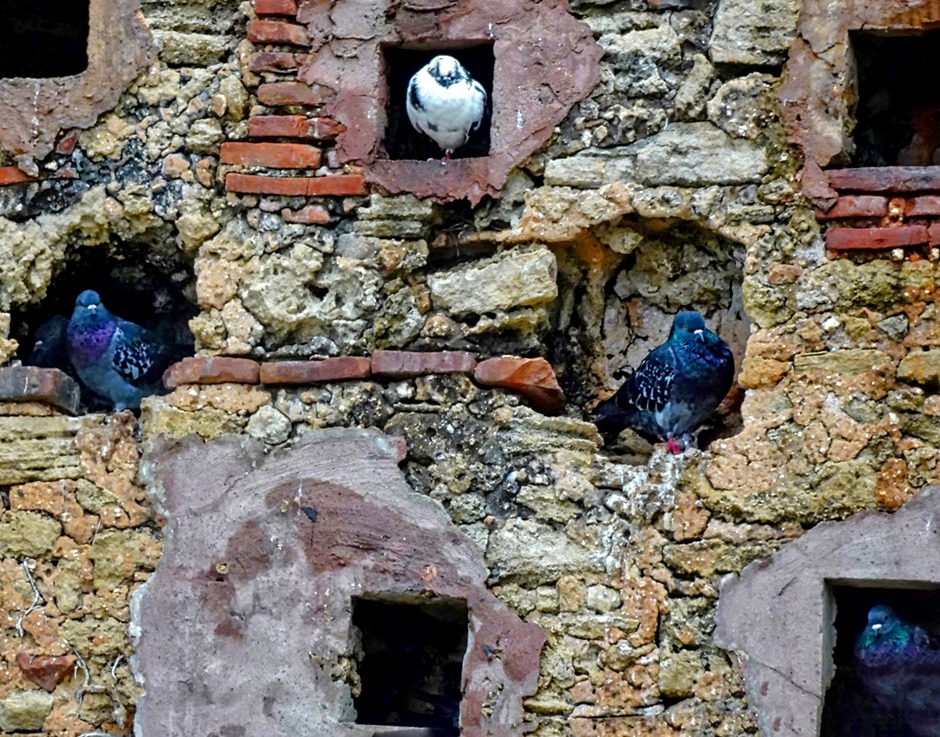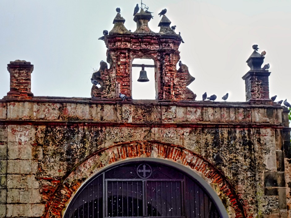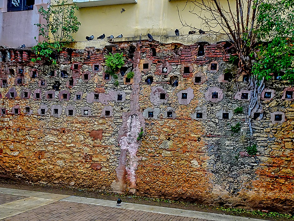 We walked over to the Parque de las Palomas (Park of the Pigeons). The park sits on top of the old city walls where it was originally built in the second half of the 18th century as a gun emplacement. Its name comes from all the pigeons that can usually be seen here (but not on the rainy day we visited) and the fact that part of this park is the only place were it is legal to feed pigeons in San Juan. The park was closed for renovation in 2015 and after being damaged by Hurricane Maria in 2017 it did not reopen until May of 2022, about 7 months before we arrived. A brick and stone wall lining the city side of the park has holes, like a dovecote, where the pigeons hang out. There are some old gnarled looking trees, colorful decorations and a killer view of the bay over the top of the city wall that must be even more spectacular when the sun is out. There were pigeons in residence but nothing like the huge crowds of birds that can be seen here on nice days when local folks are out spreading corn meal for them to eat. An arch was above the walkway in the park with a blue sign next to it: “Please do not feed the birds beyond this point.”