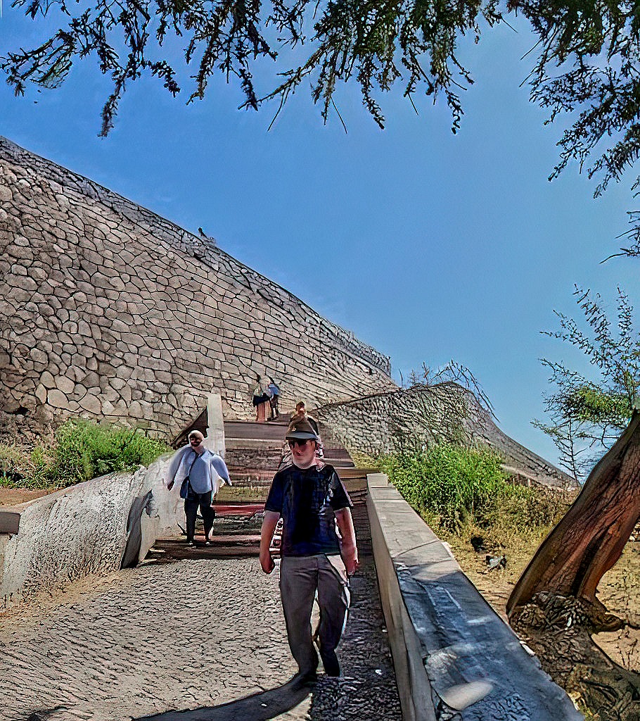 On the ocean side of the fort was a triangular extension on a lower level that once contained cannon emplacements (I’m pretty sure each of the circular markings was for one cannon). This must have been a formidable barrier for any hostile ship trying to turn this corner to enter the bay. The surf was vigorous on the rocky promontory and there was a long island with palm trees in the distance.