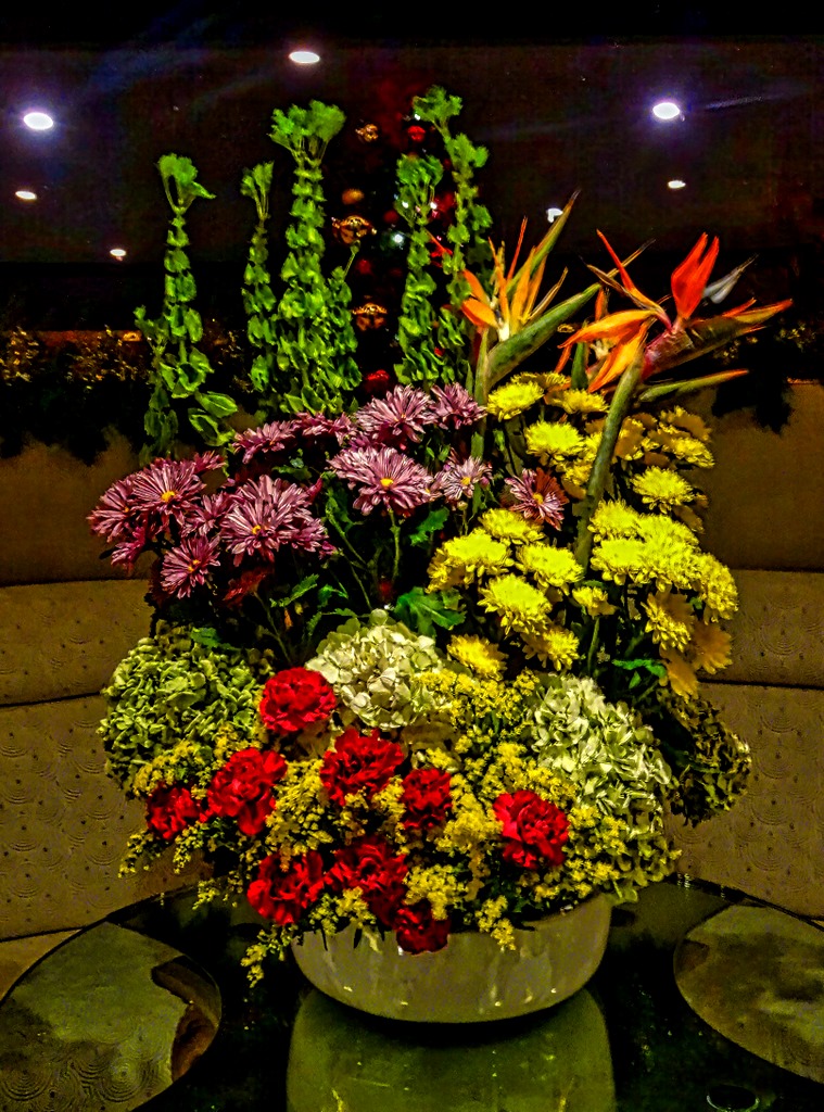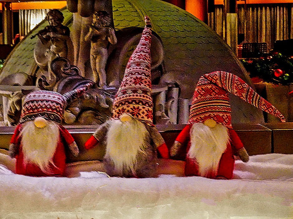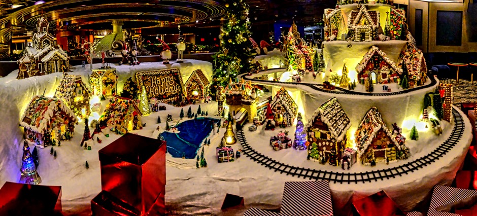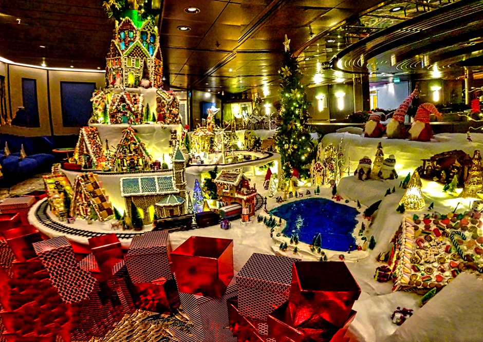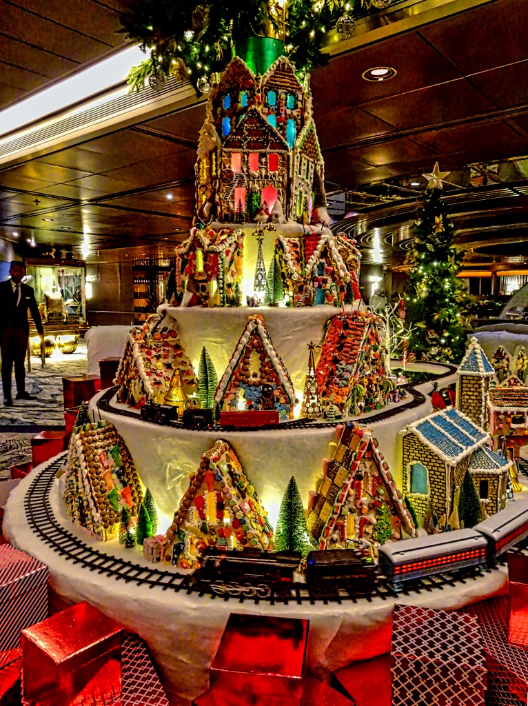 But before we leave it should be recalled that one of the downsides to this trip was the timing, getting us home (after a two day drive) on December 22, just two nights before Christmas Eve, with no time to prepare our usual family activities. The ship’s crew began decorating the ship for Christmas shortly before we left the continent of Africa, however. There were decorations all over, but Christmas Central was in the atrium with a large display that took about four days for them to complete. And when we arrived home we still had the best part of the Christmas season, spending several days with our family and watching our usual Christmas fare together on TV, primarily that old Christmas favorite the original Star Wars trilogy on Christmas day. So we will leave this episode of the blog and the entire voyage with a few Christmas pictures from the ship’s atrium.