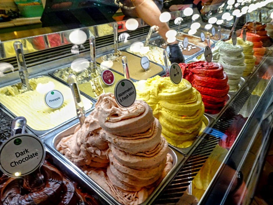 Then, a bonus! looking across the side street from our seats in the open door we spotted a sign on the wall for Anita’s gelato place. Jeremy, our cruise and travel director, had raved about this gelato place during his port talk so we decided to have dessert there. And boy was Jeremy right! We have had gelato in a lot of cities around the world but this was certainly one of the best. Not only was the gelato really good but they dished it out very generously. Only in New Zealand can we recall them packing more gelato into a single scoop. Its fun to watch them keep adding more after your cup or cone already looks more than full. We have never seen anything like that in the US before.